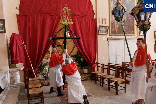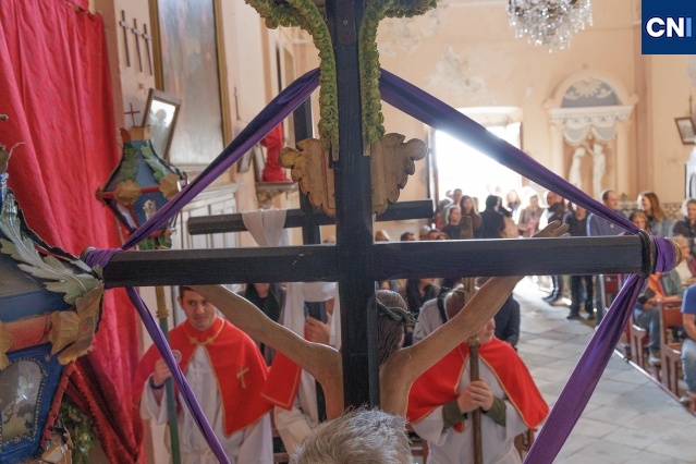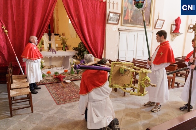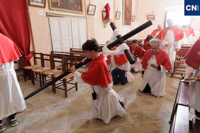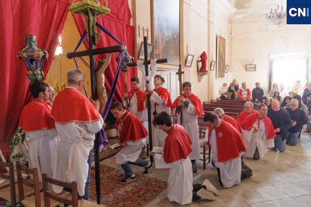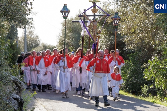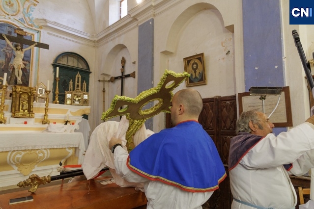Au-dessus des croix, la pulezzula - en palmes tressées dans le silence des confréries - capte la lumière du matin. Elle rappelle un autre temps, une autre entrée, celle de Jérusalem. Mais ici, sur les pentes de Lota, elle dit surtout la continuité. Celle d’un geste répété, année après année, sans mise en scène, sans folklore ajouté.
