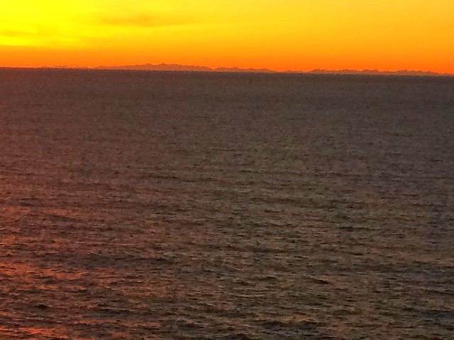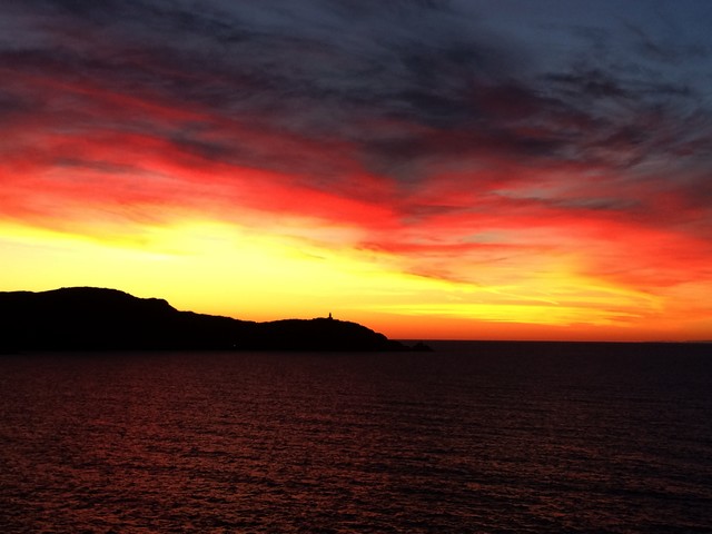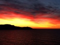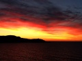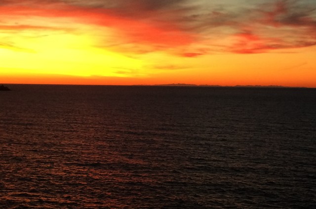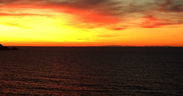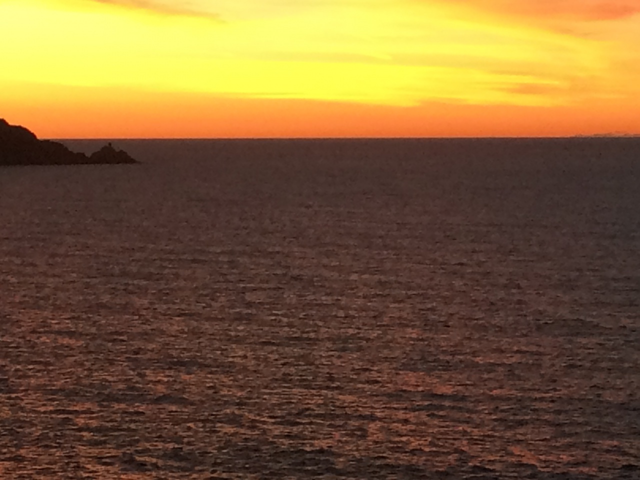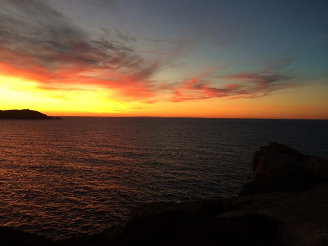 En quelques minutes, le bleu du ciel s'est éclipsé pour laisser place à une féérie de couleurs dans les tons d'une boule de feu avec sur la gauche le phare de la presqu'île de la Revellata et au fond, à l'infini les côtes continentales visibles à l'oeil nu.