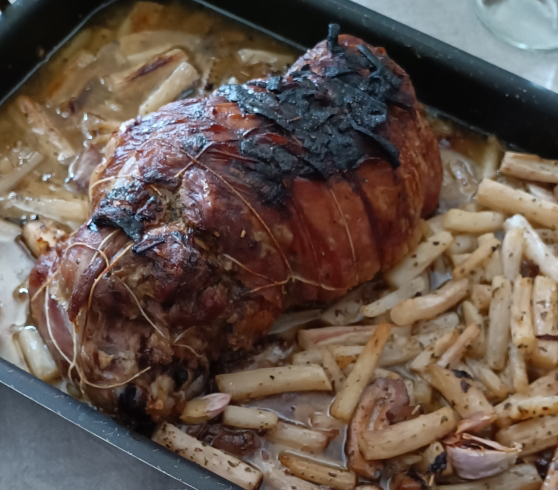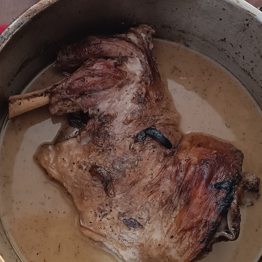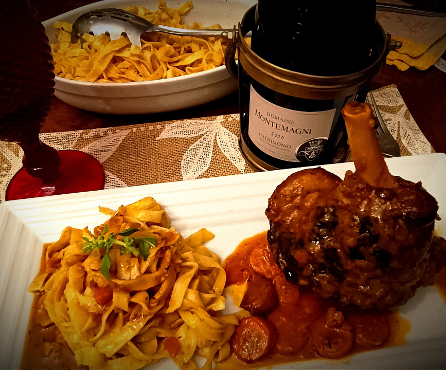 À Corte, la majorité opte pour un agneau préparé en sauce à la « stretta », autrement dit en daube, que l’on appelle ici « stufatu ». On utilise la moitié d’un agneau que l’on nettoie avec de l’eau-de-vie pour éliminer les poils, avant de le faire roussir dans de l’huile neutre. Ce roussissage, d’environ 15 minutes, est essentiel pour obtenir une sauce liée, épaisse et savoureuse – jusqu’à « liccà u bavellu ». On ajoute ensuite six ou sept gousses d’ail écrasées, on mélange bien, puis on verse la moitié d’une bonne bouteille de vin rouge avec trois cuillères à soupe de concentré de tomates. Après évaporation du vin, on couvre d’eau à hauteur et on ajoute deux feuilles de laurier et un brin de nepita. On ajuste enfin le sel et le poivre, et on laisse mijoter une heure trente. Le plat se déguste avec des lasagnes au brocciu et à la menthe fraîche, ou des tagliatelles maison parsemées de parmesan ou de casgiu vechju.
