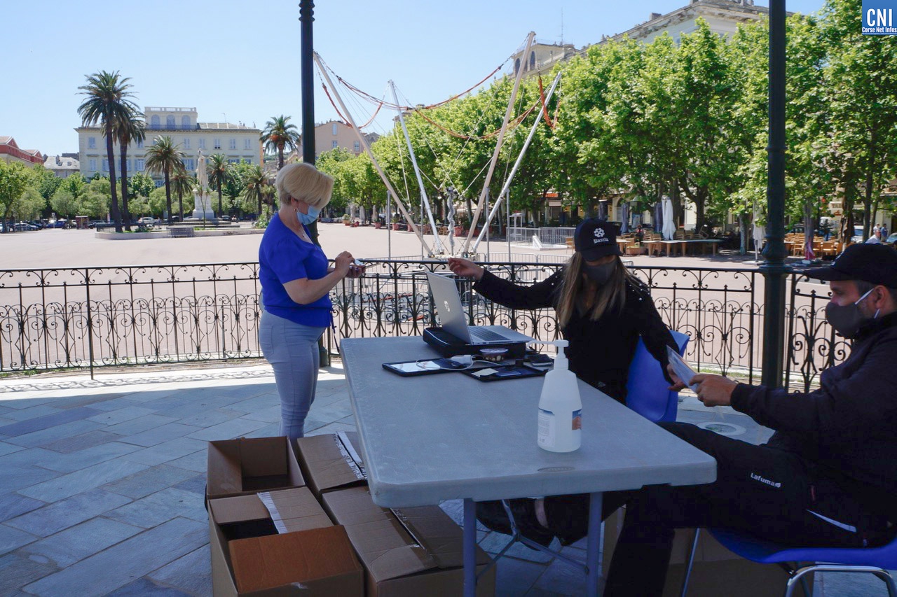 Mercredi dernier, la distribution se déroulait au Théâtre Municipal de Bastia, c’est cette fois sur la place St Nicolas, dans le kiosque à musique que l’équipe s’est installée. Aade et Stéphane sont encore là pour accueillir le public et donner un masque lavable et réutilisable aux bastiais. Leur listing est à jour et à midi, pas moins de 400 masques ont déjà été écoulés. Du côté de Lupinu, place Claude Papi, Julie et Régis ont eux déjà distribué 330 masques. « C’est plus que la semaine dernière, précise Aade, l’information est mieux passée cette fois et le bouche à oreille fonctionne. » La situation, dans le kiosque à musique, en plein milieu de la place n’est pas non plus étrangère à ce succès. « C’était même annoncé à la radio ce matin, au Forum d’RCFM. Du coup, on a du monde. On a même eu quelques “resquilleurs“ qui n’habitent pas Bastia mais franchement très peu. Ça se passe bien et avec le sourire ! » confirme Stéphane, toujours aussi accueillant.