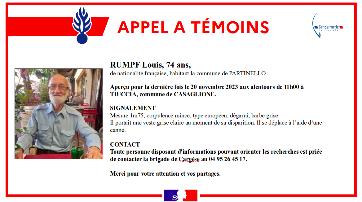 La Gendarmerie lance un appel pour retrouver Louis Rumpf, habitant à Partinello, âgé de 74 ans, porté disparu depuis le 20 novembre 2023. L'homme a été aperçu pour la dernière fois à Tiuccia sur la commune de Casaglione. vers 11h00.