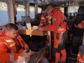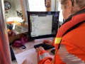 Bien que la mer soit relativement calme, l’exercice n’en reste pas moins périlleux, autant pour le barreur que pour le navigateur, qui doivent constamment être à l’affût des moindres changements en mer et de la bonne cadence du bateau. « Dans ces conditions, on a tendance à se focaliser sur les instruments et oublier qu’il y a un objectif de recherche, souligne Hervé Leroy, le barreau de l’embarcation. Grâce aux deux instructeurs, on arrive à casser des habitudes que l’on a prises avec des équipements électroniques, mais c’est sûr qu’il y aura encore besoin d’un travail de compagnonnage en station une fois que l’exercice sera terminé ». De son côté, Yohann Simoni, le navigateur de l’équipe, acquiesce et ajoute que « cet exercice nous aide à gagner en compétence et à travailler notre complémentarité en binôme. C’est grâce à ce genre de mission que l’on arrive à mettre en place certains codes entre deux personnes qui travaillent régulièrement ensemble, ce qui au final nous rend plus efficaces ».
