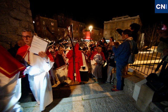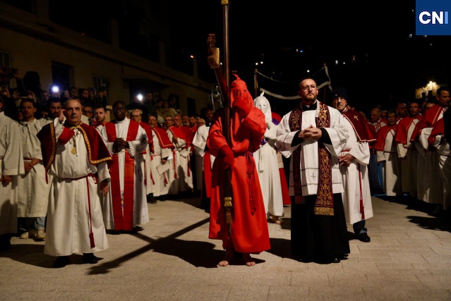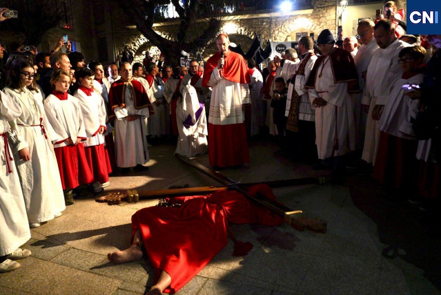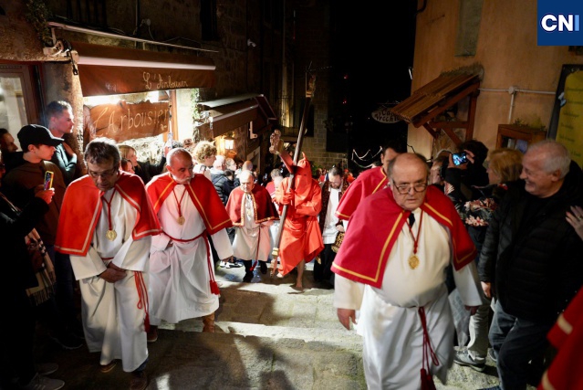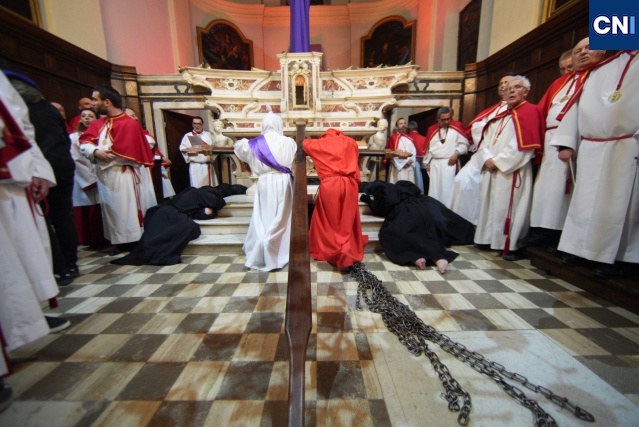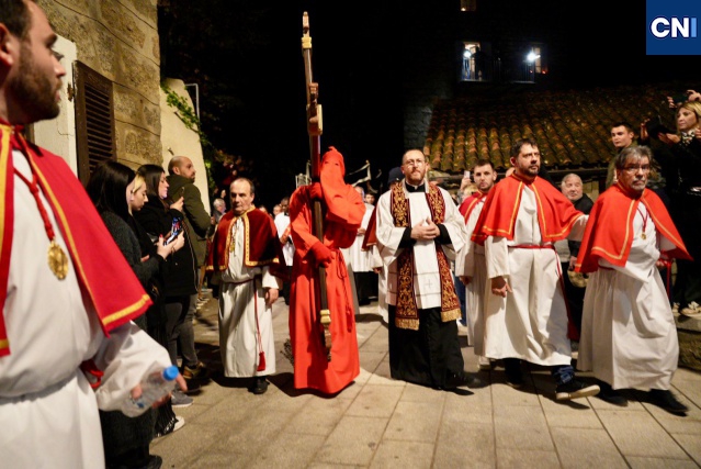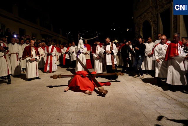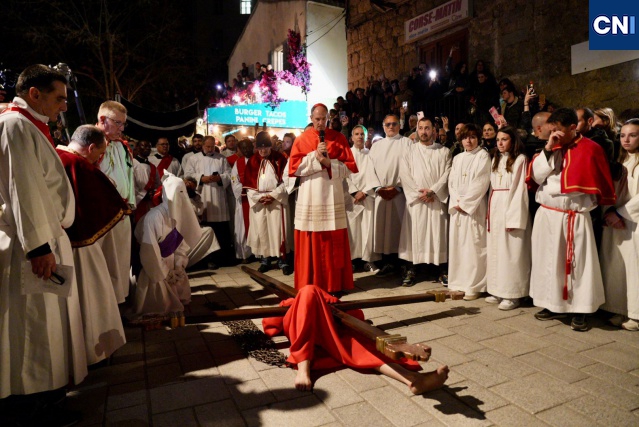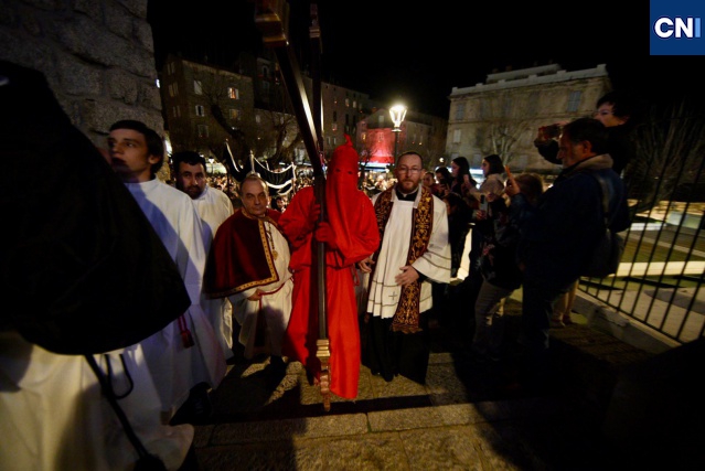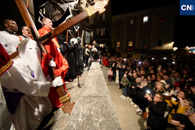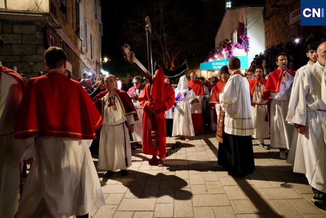 À travers les rues de la ville, le Catenacciu a tracé son chemin de croix, symbolisant la montée du Christ au Golgotha. Revêtu de rouge et dissimulé sous une cagoule, le pénitent anonyme portait sur ses épaules une croix imposante de 37 kilos, accompagnée de chaînes pesant 17 kilos. Tel Jésus sur le chemin du Calvaire, il est tombé à trois reprises, marquant ainsi le parcours de cette procession empreinte de symbolisme.