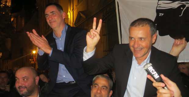 Les deux leader nationalistes, Gilles Simeoni, nouveau président du Conseil exécutif, et Jean-Guy Talamoni, nouveau président de l'Assemblée de Corse, portés en triomphe par une foule en liesse devant l'ancienne mairie de Bastia.