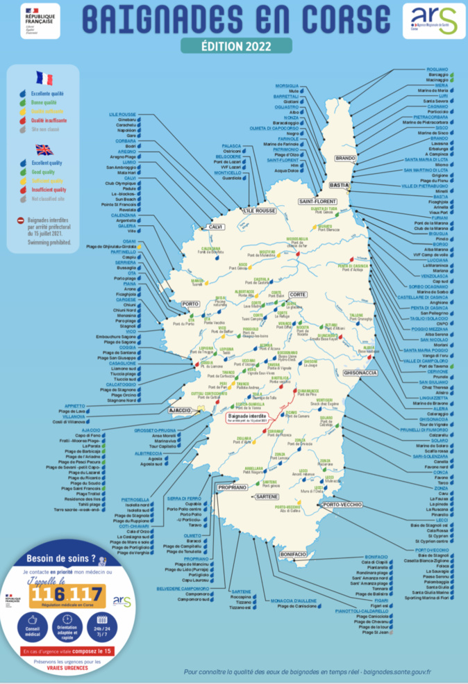 La baignade est restée courant saison 2021 interdite de façon permanente, compte tenu de la qualité dégradée de l’eau ou des risques liés à la sécurité, en Corse-du-Sud sur un tronçon du Taravo entre le Pont de Piconca commune de Corrano et le Pont de Pinu commune de Ciamanacce ainsi que sur le « Ponte-Vecchio » à Bastelica, « Alzu-di-Gallina » à Porto-Vecchio, « Pont de Cuttoli » à Cuttoli-Corticchiato, « Pont du Liamone » communes de Coggia et Casaglione et « Plage de Girolata » Commune d’Osani.