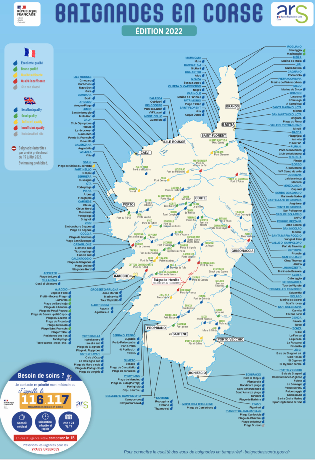 Mais la baignade peut présenter des risques pour la santé si une pollution affecte la qualité de l’eau et pour éviter que un moment de plaisir vire au cauchemar, notamment à cause d'une mauvaise qualité bactériologique de l'eau qui peut être à l’origine de différentes pathologies (gastro-entérite, leptospirose, dermatite), l'Agence régionale de santé de Corse surveille la qualité des eaux naturelles. Et le bilan 2021 qui vient d'être publié est très positif, notamment pour les eaux de mer. Plus de 1788 contrôles ont été réalisés en 2021, sur 229 sites de baignades dont 55 en eau douce (rivières, lacs) et 174 en mer. 97% des baignades en Corse sont conformes aux exigences européennes de qualité, le classement étant basé sur les résultats obtenus au cours des 4 dernières années.