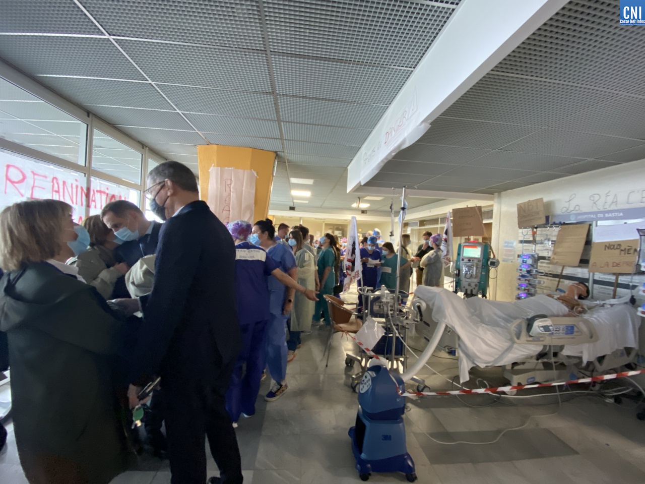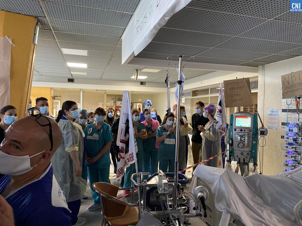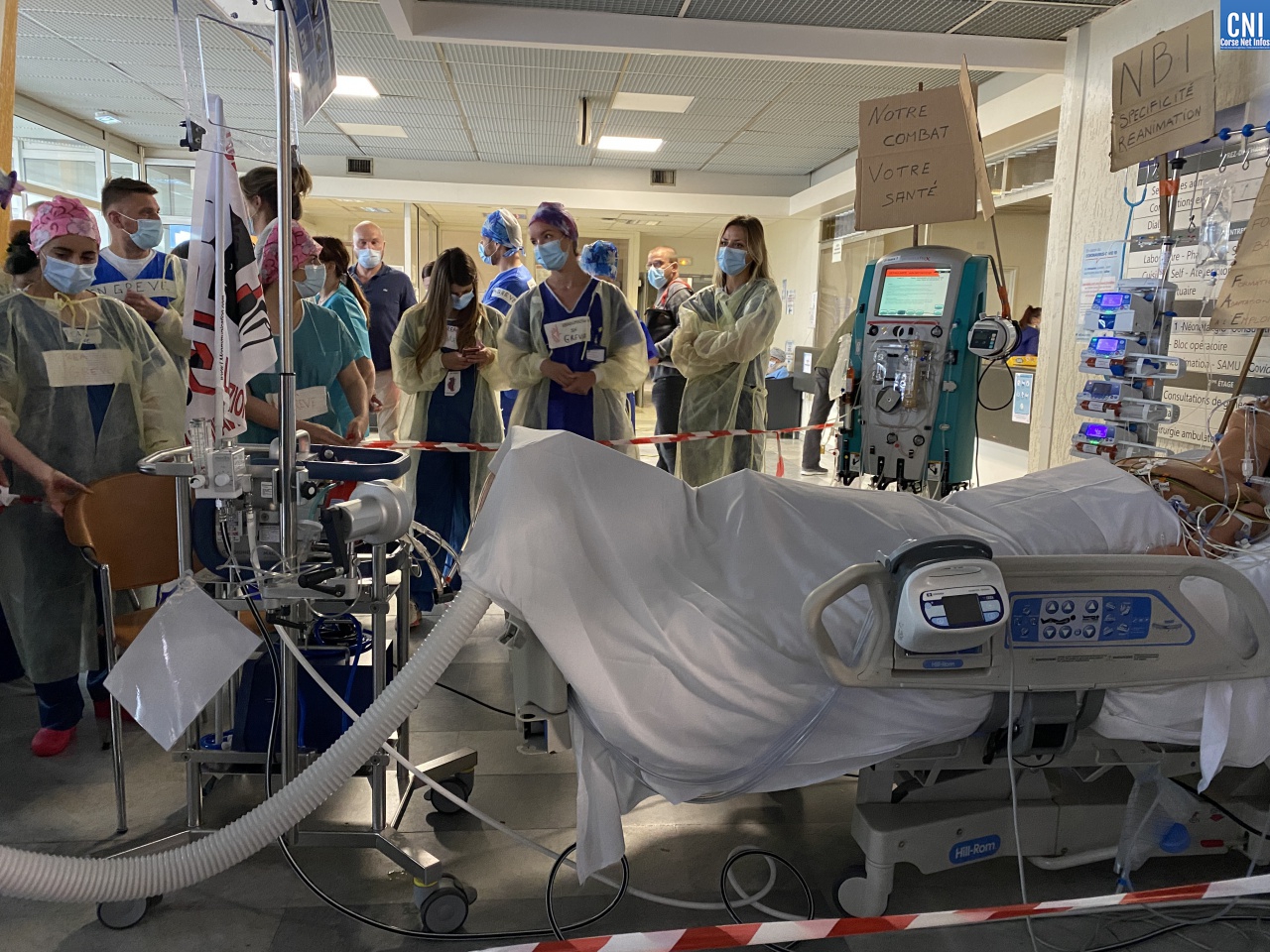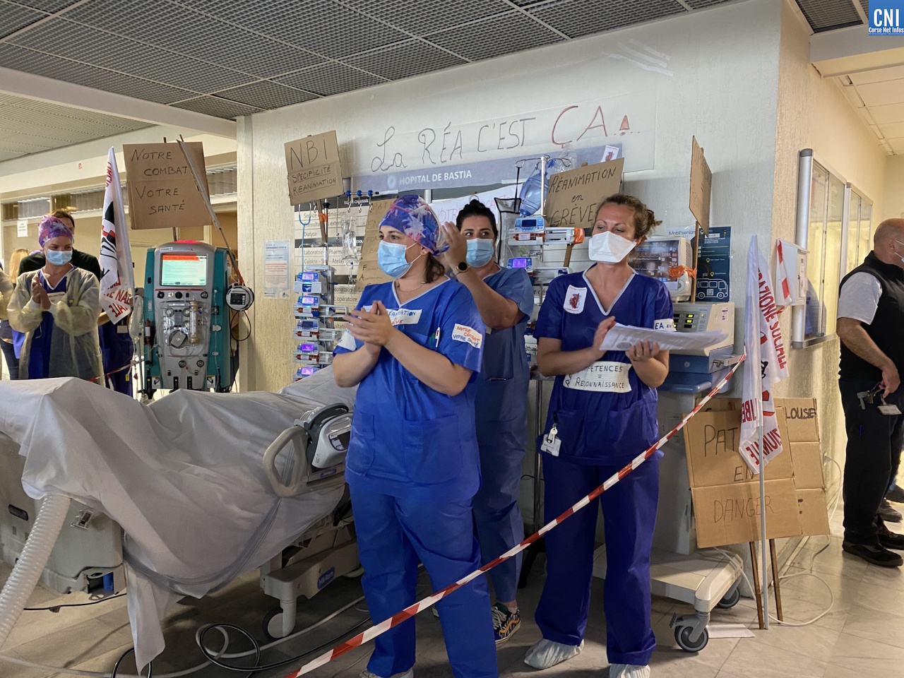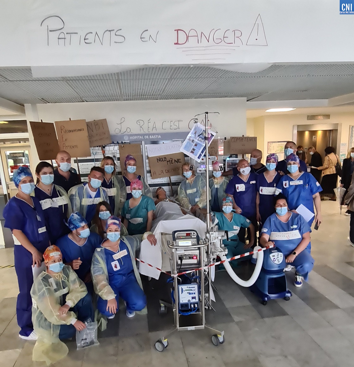 Dans un courrier adressé au ministère de la Santé ainsi qu'à l'Agence régionale de Santé Corse, l'équipe paramédicale du Service de réanimation réclame des effectifs supplémentaires pour l'hôpital de Bastia et d'Ajaccio soit 1 infirmier pour 2 patients et 1 aide-soignant (AS) pour 3 patients alors qu'actuellement la moyenne tournerait en réanimation autour de 1 infirmier pour 2,5 patients et un AS pour 4 patients.