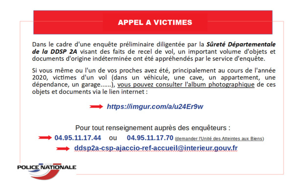 La direction départementale de la sécurité publique de Corse-du-Sud vient, dans le cadre d'une enquête préliminaire pour recel de vol, de mettre la main sur un important lots d'objets volés et de documents d'origine indéterminée. Si vous avez été victime de...