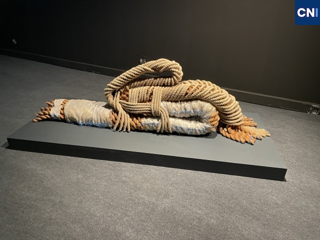 Au centre de la salle, une sculpture de l'artiste textile Françoise Grossen, intitulée Embryo, ajoute une dimension forte à l’exposition. Réalisée en 1987, cette œuvre faite de cordes nouées et entrelacées évoque à la fois la contrainte et la renaissance. Selon Juana Macari, cette sculpture "symbolise la promesse d’un nouvel avenir, d’une liberté retrouvée, en particulier pour les femmes iraniennes en quête de justice et d’émancipation."