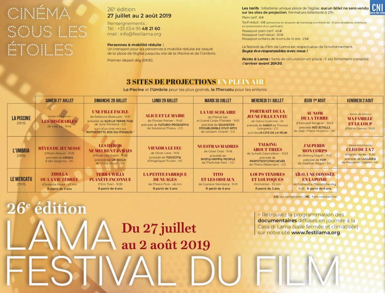 Car depuis bientôt 26 ans de nombreux cinéphiles rejoignent le village de Lama, perché sur ses montagnes aux portes de la Balagne, pour profiter de projections en plein air à la nuit tombée. Après un mémorable 25e anniversaire, le festival joue la carte du renouveau. Jean-Louise Devèze, Président du festival ne s’en cache pas, la force de ce festival est de ne pas regarder en arrière et chercher à innover. Et le pari semble réussi car si les projections à la nuit tombée reste le fil rouge de cette manifestation, on constate plusieurs nouveautés dans la programmation.
