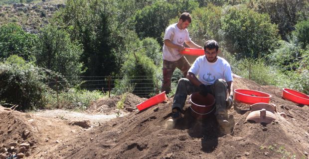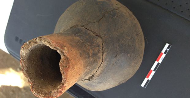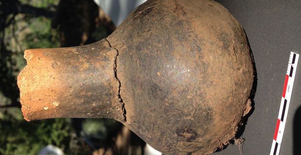 - L’an dernier, nous avons fouillé au pied du rempart dans une zone très remaniée. Cette année, en nous éloignant du rempart, nous sommes tombés sur un habitat qui a été occupé de manière intensive. Dans cet habitat, nous avons fait des découvertes exceptionnelles, notamment un foyer entier, a zilia, sur lequel les hommes du Néolithique faisaient le feu, et de l’argile, a terra rossa, qui était peut-être du pisé tombé du toit. Egalement, une bouteille entière en céramique intacte, près de 5000 ans après qu’elle ait été déposée, ce qui est très rare ! Ainsi qu’un vase éclaté tel quel et une abondance de fusaïole, ce qui semble indiquer que l’on tissait de la laine à cet endroit. Enfin, nous avons fait une découverte majeure : un lingot de cuivre, des scories de cuivre et, peut-être même du minerai à l’état naturel. Il faudra procéder à des analyses pour le confirmer.