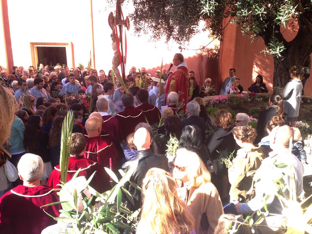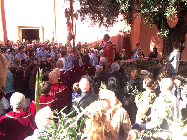 Traditionnellement, la bénédiction des Rameaux, a lieu dans le petit jardinet jouxtant l'église Sainte-Marie Majeure de Calvi où les fidèles sont rassemblés avant l'arrivée des confrères de Saint-Antoine et Saint-Erasme. La Croix du Christ ornée d'un ruban rouge est portée par un confrère.