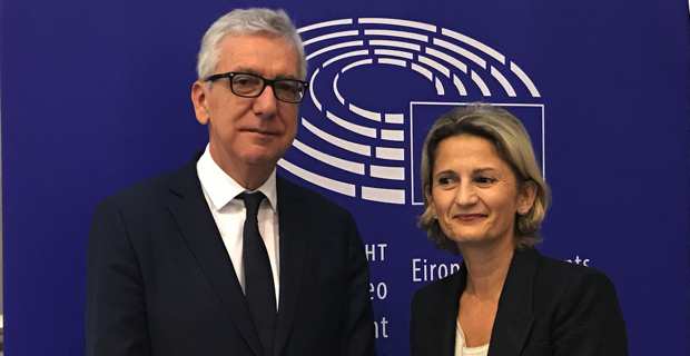 Francesco Pigliaru, président de la Région autonome de Sardaigne et Nanette Maupertuis, conseillère exécutive en charge des affaires européennes, présidente de l'Agence du tourisme, tous deux membres du Comité européen des régions, lors de la dernière session plénière, les 5 et 6 décembre, à Bruxelles