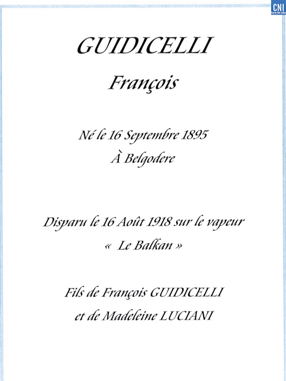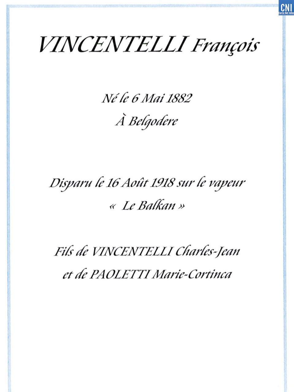 En permission, François Vincentelli et François Guidicelli ont embarqués sur le vapeur Le Balkan, reliant Marseille à Calvi, pour rentrer chez eux à Belgudè. Dans la nuit du 15 au 16 août, alors que le navire ne se trouvait qu'à quelques miles de Calvi, il a été torpillé par le UB-48, sous-marin allemand. À son bord, 519 passagers, dont 300 soldats en permission. Les deux François de Belgudè, âgés de 36 et 23 ans, seront portés disparus en mer le 16 août 1918 avec 417 autres passagers.
