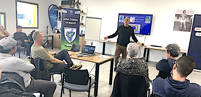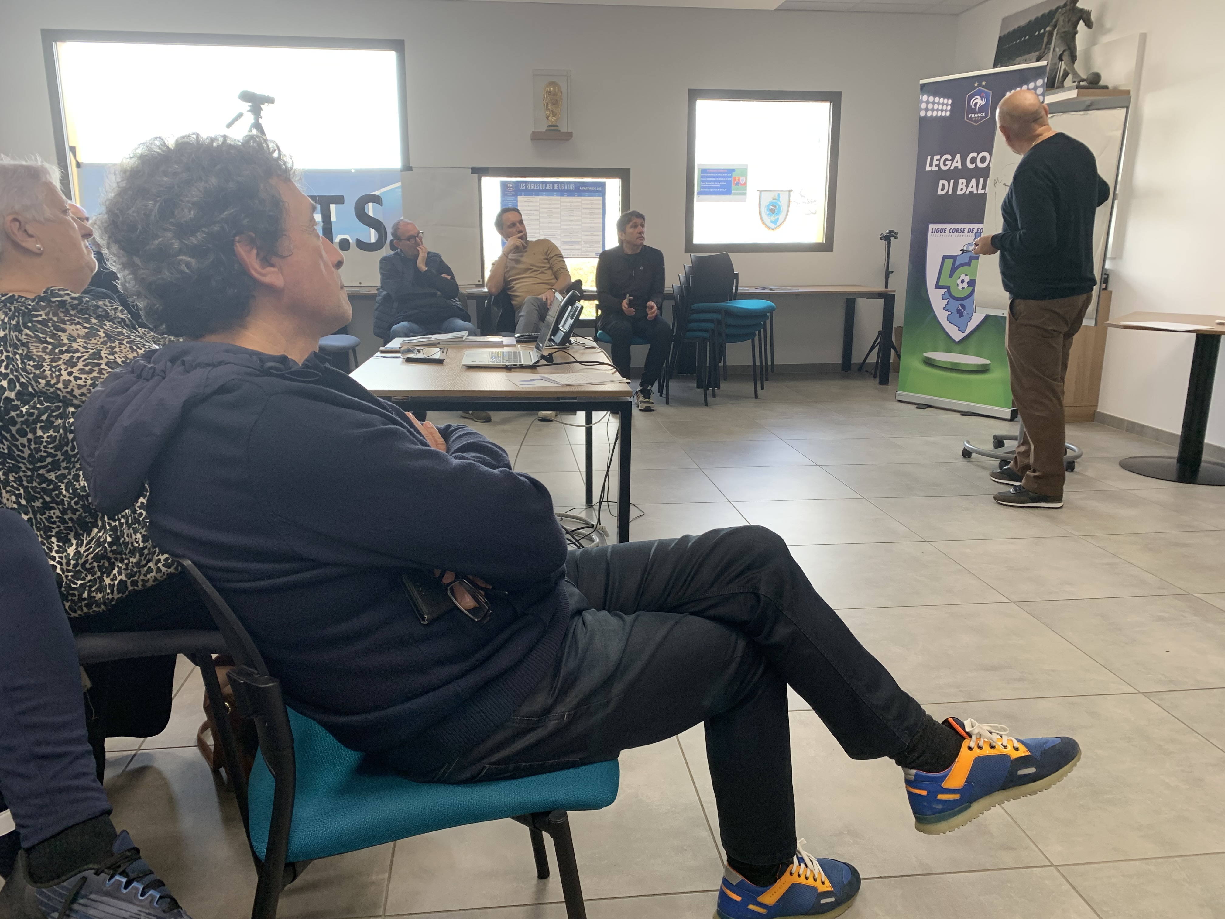 Frédéric Antonetti devant les éducateurs, attentifs, de l'Amicale.