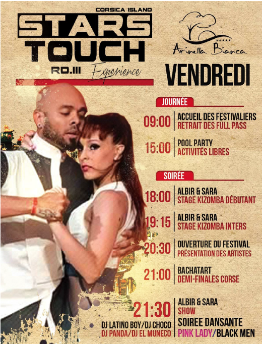 Trois jours de stages de danse et de shows avec les plus grands artistes de la scène internationale dans les disciplines de bachata, salsa et kizomba animeront le village de vacances d'Arinella bianca. Rendez vous incontournable pour tous les aficionados du monde latino en Corse, ces soirées dansantes vous permettront de rencontrer et d'échanger avec les stars.