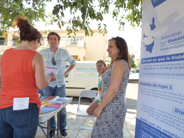 A l'ombre des arbres qui bordent la place de la mairie, le stand de l'AFD 20 est installé depuis 16 heures. Sur la table, de nombreux flyers de prévention, de conseils et d'information sur cette maladie qu'est le diabète sont disposés. Diabète de type 1 insulino-dépendant mais aussi et surtout diabète de type 2 sont décrits sur les documents proposés par l'association. Pour le premier qui touche surtout les sujets jeunes, enfants, adolescents ou adultes jeunes, la prévention ne peut s'exercer qu' à la découverte de la maladie que l'on qualifie volontiers de maladie auto immune car ne dépendant point d'un comportement alimentaire à risques. Prédisposition génétique ou environnement pourraient être les causes de cette maladie qui détruit les cellules beta du pancréas.