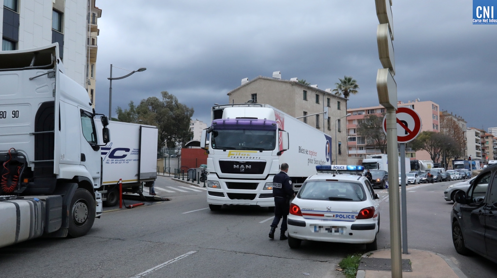11 heures : les camions arrivent en force et commencent à se garer les uns derrière les autres sur une voie à l'entrée d'Ajaccio. C’est la panique, la grogne monte.