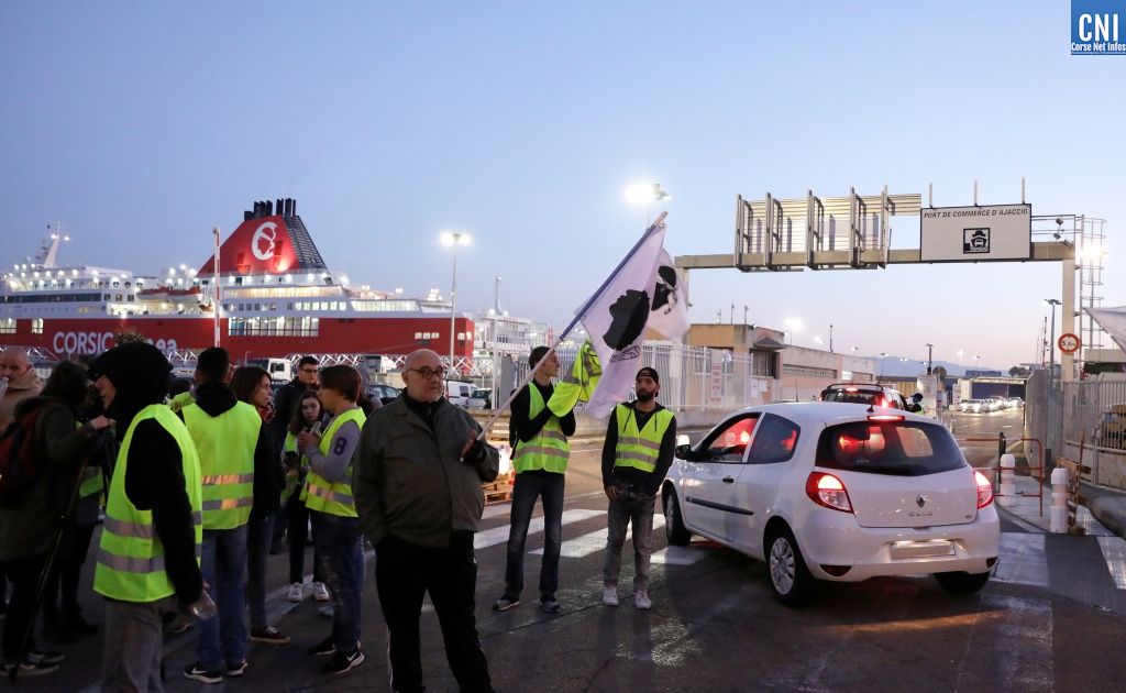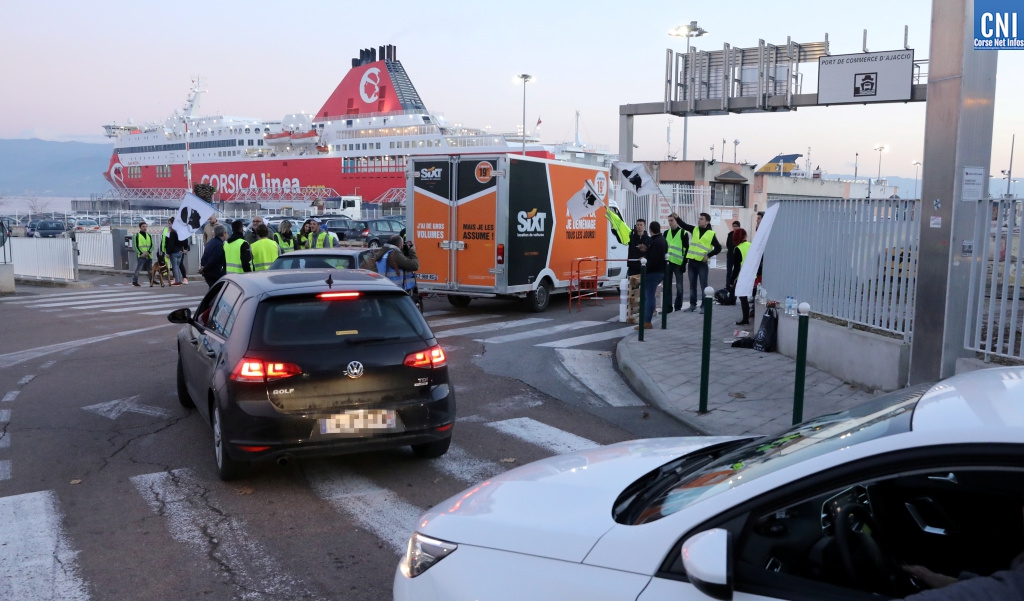 Peu avant 17 heures, l’entrée du port d’Ajaccio est bloquée par les gilets jaunes. Banderoles, drapeaux corses, voitures devant le portail d’entrée, les grévistes attendent l’heure d’embarquement des passagers…