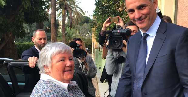 La Madame Corse du gouvernement, la ministre Jacqueline Gourault, accueillie à son arrivée à l'hôtel de région à Ajaccio par le président du Conseil exécutif de la nouvelle collectivité de Corse, Gilles Simeoni.