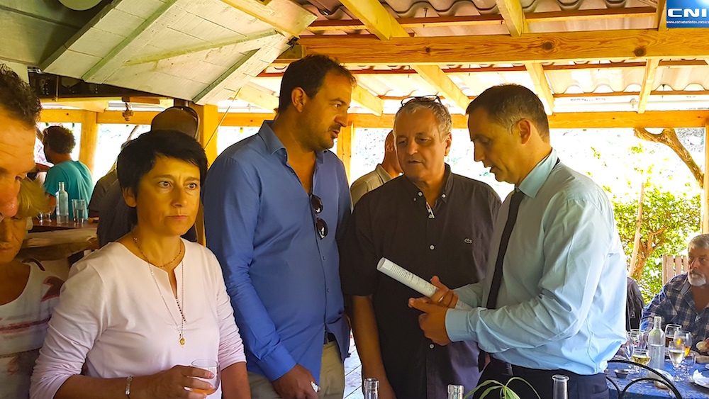 François Alfonsi, le maire d'Osani, les membres du conseil municipal, Gilles Simeoni, président du Conseil exécutif, Jean-Philippe Legueult, directeur de cabinet du préfet, Fabienne Giovannini, présidente de l'AUE