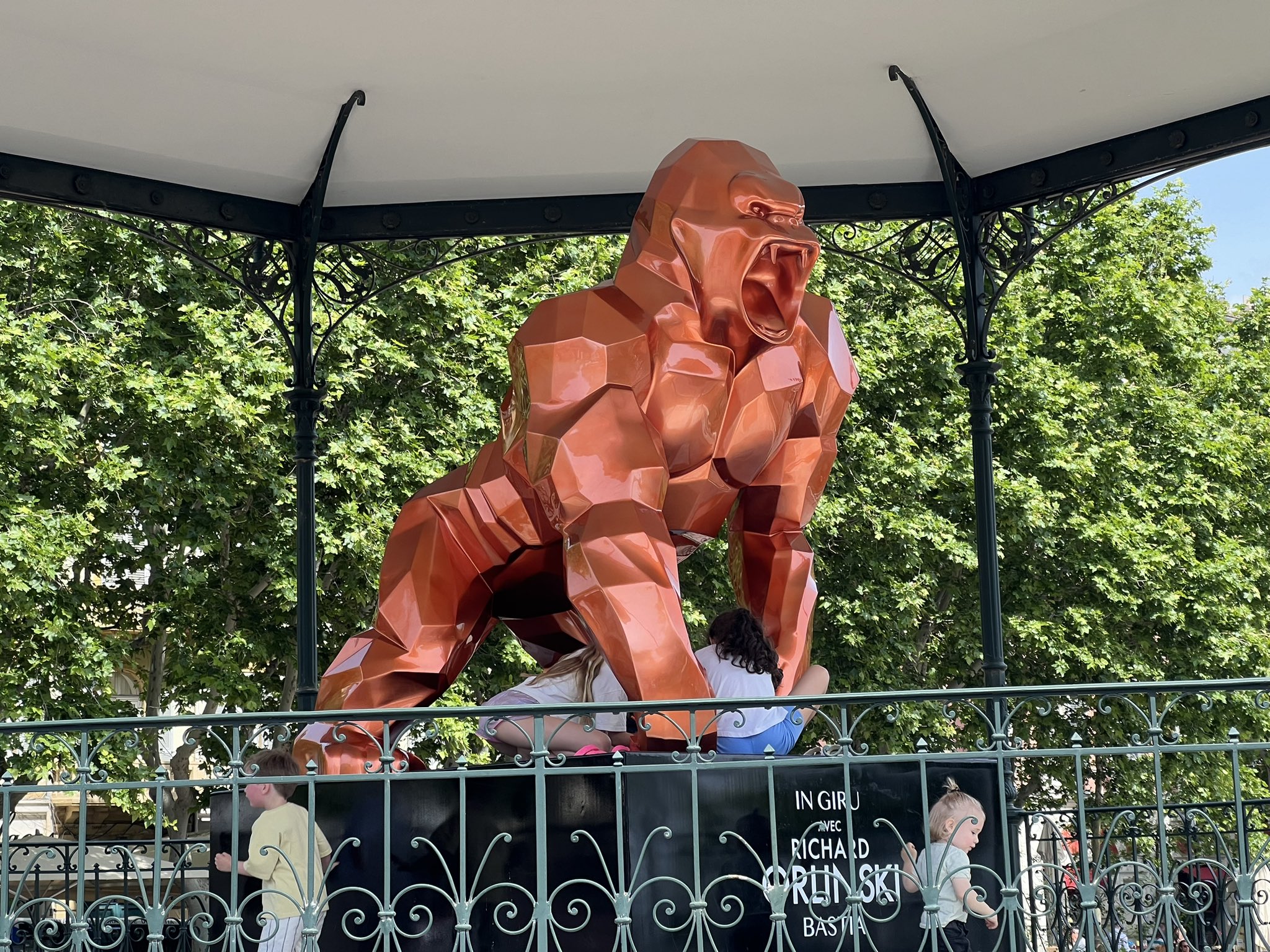 Sur le vieux port de Bastia, au pied de l’escalier Romieu, touristes et riverains s’arrêtent pour admirer le Roaring Lion. Haute de cinq mètres, cette sculpture représentant le roi des animaux est l’une des six œuvres créées par Richard Orlinski, installées sur le territoire de la Communauté d’Agglomérations de Bastia (CAB), à l’occasion de la troisième édition de In Giru, itinéraire artistique. Déployée à l’initiative de l’Office de Tourisme intercommunal de la ville, cette opération présente à Furiani, Bastia, Petrabugnu, Santa-Maria-di-Lota, et San Martinu di Lota depuis le 17 mai a notamment pour dessein de « faire découvrir le territoire d’une autre manière », et de le « magnifier ». Ainsi, sont exposés jusqu’au 4 octobre prochain, deux gorilles, un lion, une panthère, un crocodile et un ours, tous faits de résines, et conçus par l’artiste entre 2006 et 2020.
