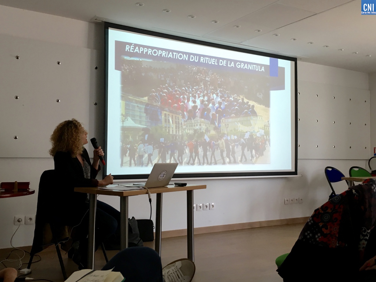 Dans la Licence Arts du Spectacle qui a une riche programmation alliant recherche scientifique et création artistique, Davia Benedetti promeut les pratiques ethnoscénologiques. Dans sa conférence elle explique que la société corse perd l’usage de certains de ses marqueurs identitaires tels la langue, certaines coutumes et certains rituels. Elle a présenté le contexte corse, historiquement aux prises avec une politique étatique française assimilationniste, en soulignant les nouvelles mobilités et les changements numériques actuels qui modifient le milieu et les liens sociaux. Cependant, souligne-t-elle, une conscience collective identitaire corse reste dynamique et trouve de nouveaux moyens d’expression dans la mise en spectacle. "C'est l'identité qui se joue au niveau du corps et de la mise en spectacle. À partir de la collecte d'informations, la retranscription ne se fait pas par des écrits scientifiques mais elle est valorisée par un spectacle vivant. C'est ce qui est novateur."Ainsi, le spectacle Uchjata,à Sartè, en novembre 2017 a été créé à partir d’une collecte d'informations et de témoignages, in situ, sur le rituel de l’ochju. C'est une retranscription artistique aux dimensions anthropologiques. De même, c’est en se référant à la granitula de la Santa du Niolu que le Collectif Parlemu Corsu a effectué, en octobre 2015, une granitularevendicative pour la langue corse. Ces pratiques spectaculaires constituent des moments de cohésion collective et d’apaisement. L'ethnoscénologie est une démarche pionnière en Corse qui peut mobiliser différents chercheurs.