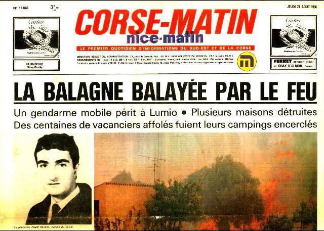 Ce mercredi 20 août 1986, la Balagne est ravagée par de nombreux incendiés attisés par un vent violent. Z Lumio, alors que l'on pense la situation sous contrôle, à la radio du Poste Opérationnel la terrible nouvelle tombe : Un gendarme Mobile de la Légion de Gendarmerie Nord - Pas de Calais, Pascal Beneito, 23 ans a été pris par les flammes alors qu'il tentait de porter secours à une personne piégée par le feu.
