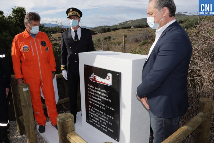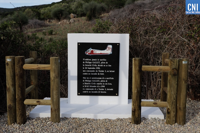 En français et en corse ont pouvait y lire : « N'oublions jamais le sacrifice de Philippe Gallet, pilote de la Sécurité Civile, décédé en ce lieu le 24 septembre 1990 aux commandes du 'Tracker 3 » en luttant contre un incendie de forêt » - « Mai ù ci sminticaremu di u sacrifiziu di Philippe Gallet, pilota di a Sécurità Civile smaritu in stu locu, u 24 Sitembre di u 1990 à e cummande di u Tracker 3, luttendu contr'à un incendiu di furesta ».