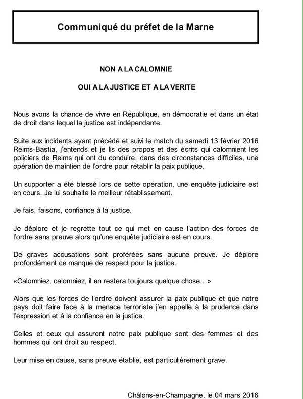 "J’entends et je lis des propos et des écrits qui calomnient les policiers de Reims qui ont du conduire, dans des circonstances difficiles, une opération de maintien de l’ordre pour rétablir la paix publique", écrit le préfet de la Marne, qui après avoir rappelé qu'une enquête judiciaire est ouverte s'élève contre de "graves accusations proférées sans aucune preuve".