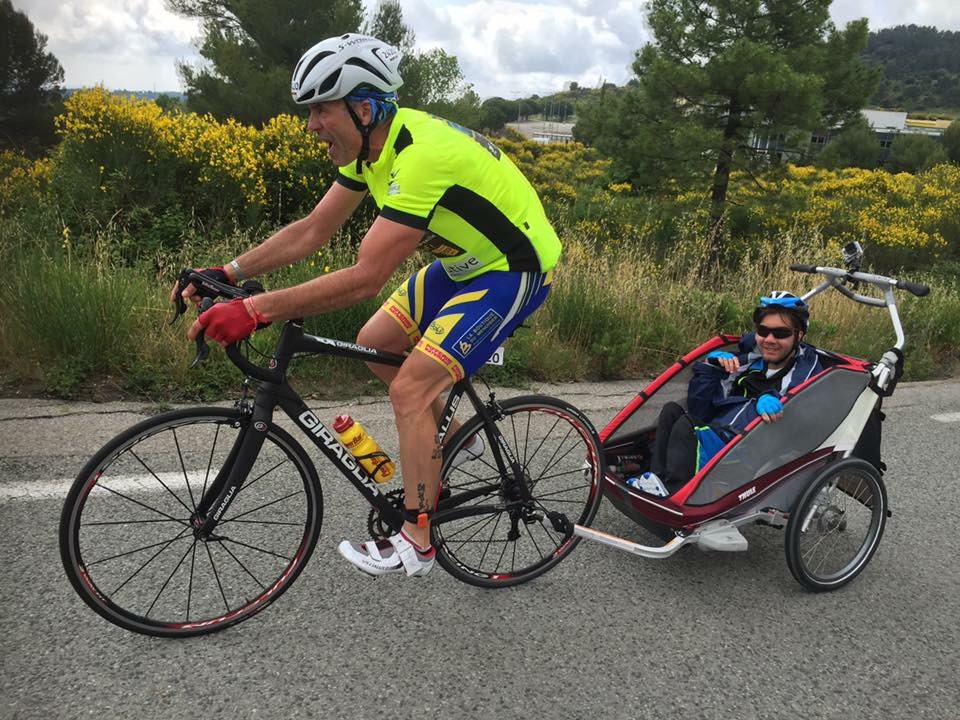 C’est en fait une véritable leçon de courage, de vie qui a été servi sur un plateau aux sportifs du monde de l’extrême. Un exploit hors du commun dont peu de gens peuvent se flatter de réaliser. Pour Christophe, c’est la 5ème participation à cet évènement. L’Iron Man de Nice est à juste titre considéré comme une des épreuves les plus difficiles d’Europe. Au programme, 3.8 km de natation, 180 km de vélo et un marathon. 8 à 9 heures d’efforts pour les plus rapides, beaucoup plus pour les autres, plus encore pour Christophe Santini qui nage, pédale et court avec Kevin accroché à sa passion.