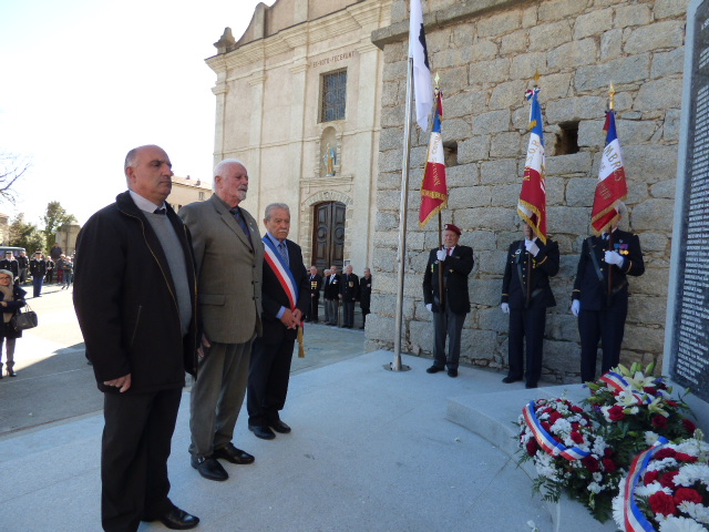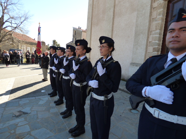 A l'issue de la cérémonie religieuse, en présence d'une foule importante, de deux détachements militaires, gendarmerie et armée de l'air, de nombreux élus et représentants d'associations d'anciens combattants, le colonel Le Bouil commandant la base aérienne a passé en revue les troupes, secondé par le commandant Charpentier commandant la compagnie de gendarmerie de Ghisonaccia. Puis une fois la stèle bénie par l'abbé Renucci qui a placé cette dernière sous la protection de la Vierge Marie en demandant que le Dio Vi Salvi Regina soit entonné, les autorités présentes ont déposé les gerbes de fleurs au pied du monument. On notait pour le conseil général de la Haute Corse la présence de Francis Giudici, et l'on déplorait par ailleurs l'absence d'une représentation préfectorale.