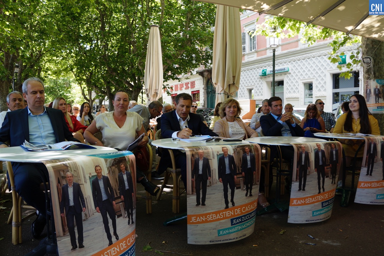 Jean-Sébastien De Casalta prend la parole en premier et commence par présenter son équipe. A ses côtés, se trouvent Jean Zuccarelli, Françoise Vesperini, Hélène Salge, Jean-Martin Mondoloni et Livia Graziani-Sanciu. Il entre très vite dans le vif du sujet et présente « ce projet que nous avons construit, sur cette alliance que nous avons scellée, sur ce pacte de mandature et de confiance que nous avons établi et qui nous permettent aujourd’hui d’être dépositaires d’une alternative fiable et crédible pour conduire […], après le 28 juin, le Bastia de demain. »