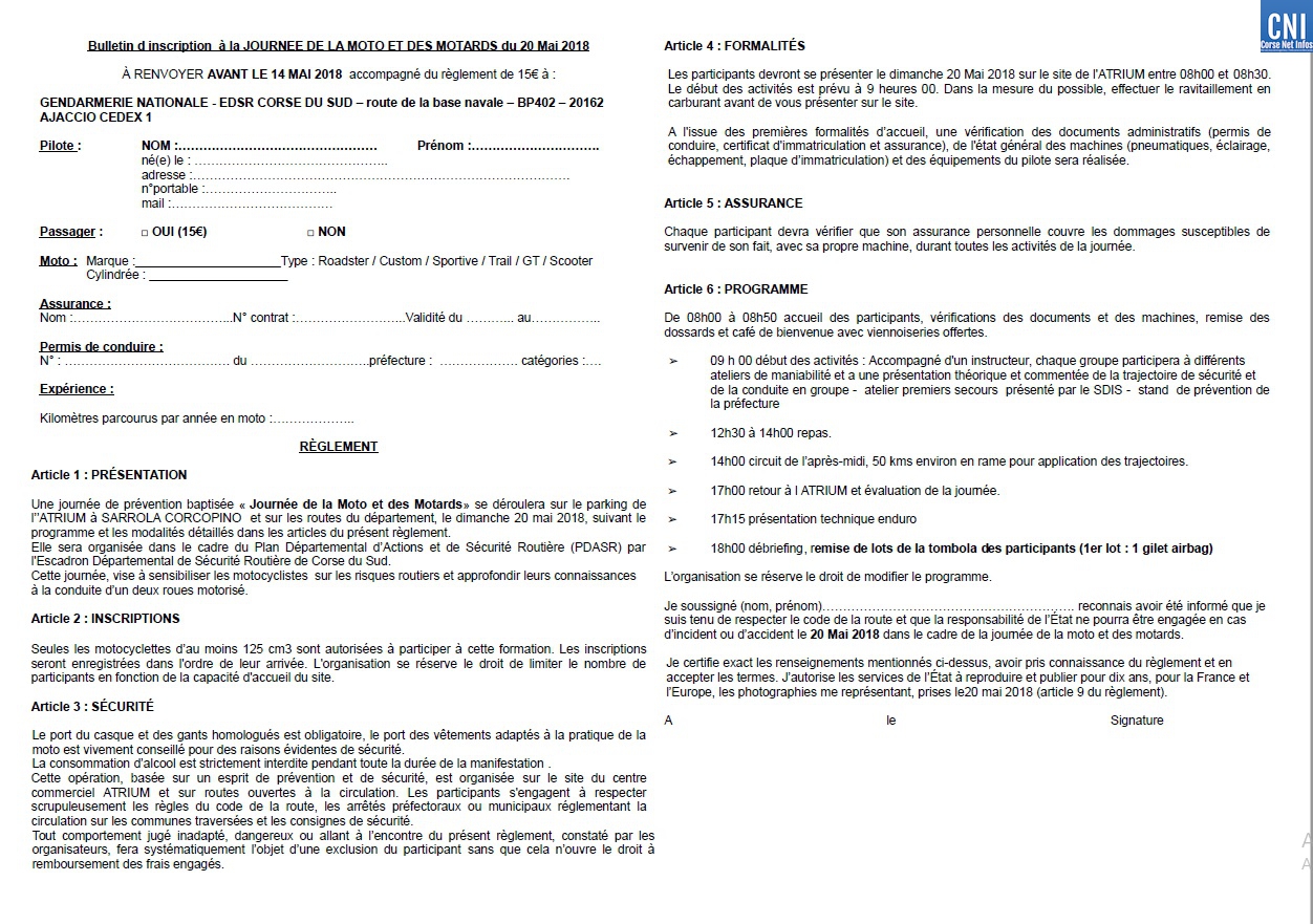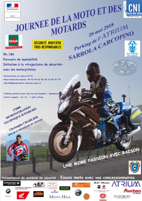 Organisée par l'EDSR de la Corse du Sud, cette journée se veut uniquement tournée vers la prévention et le contact avec le motard civil. Des partenaires se sont joints à cette journée : la préfecture de Corse, la DDTM-ODSR (simulateur moto), les pompiers - SIS Corse du sud – qui présenteront un atelier de premier secours, mais aussi les concessionnaires locaux qui sont invités à présenter du matériel de sécurité lié à la pratique du deux roues (casques, gants, airbargs...) ils présenteront aussi des modèles de motos et les feront essayer aux visiteurs sous leur responsabilité.