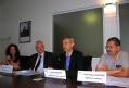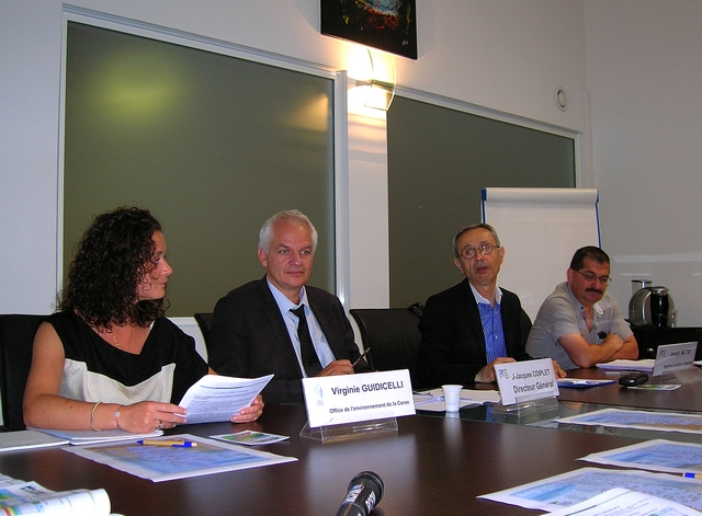Virginie Guidicelli pour l'Office de l'Environnement de la Corse, Jean-Jacques Coiplet, le directeur général de l'ARS, Joseph Mattei, ingénieur sanitaire régional et Jean-Dominique Chiappini, ingénieur sanitaire pour la Corse-du-Sud, lors de la conférence de presse de l'ARS, qui s'est tenue ce mercredi matin à 10h à Ajaccio. (Photos : Yannis-Christophe Garcia)