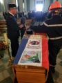 Au pied de l'autel, le cercueil, était recouvert du drapeau tricolore aux armes des pompiers, alors que sa petite fille déposait son képi alors que derrière Petru-Pà, jeune Sapeur-Pompier en grand uniforme, petit-fils de Jean-Paul Beneteau portait non sans fierté un coussinet de velours avec les médailles de son papy et assurant la relève.