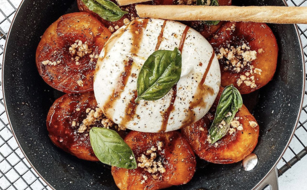 A table : pêches rôties au miel et burrata avec #lapetitecuisinedemarie