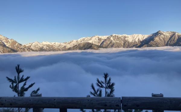 Les sommets enneigés du sud de l'île sont éclaboussés par les rayons du soleil. Plus bas, sur la route du col de Sorba, tout est pris dans une mer de nuages. Ce moment magique, où les nuages semblent à portée de main, a été saisi par Pierre-Christophe Leoni...
