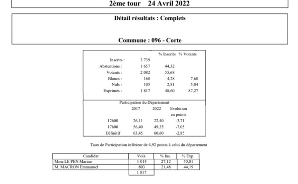 À l'occasion du second tour de l'élection présidentielle 2022, ce dimanche 24 avril les Cortenais ont en majorité accordé leur soutien à la candidate RN Marine Le Pen, qui a obtenu 55,81 % des votes. Les 44,19 % restants reviennent au président sortant...