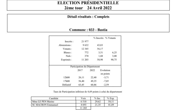 A Bastia Marine Le Pen est arrivée en tête du second tour de l'élection présidentielle. À l'occasion du second tour de l'élection présidentielle 2022, la candidate RN a obtenu la majorité des voix avec un score de 58,11 %. Elle bénéficie d'une avance...