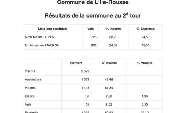 À l'occasion du second tour de l'élection présidentielle 2022, ce dimanche 24 avril les électeurs de L'Ile-Rousse ont majoritairement choisi Marine Le Pen, qui a remporté 54,5 % des voix exprimées.Les 45,5 % restants reviennent au Président sortant Emmanuel...