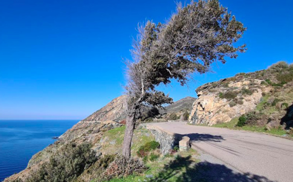 Le vent d'ouest à nord-ouest se renforce très nettement en début de journée de lundi.Les rafales atteignent fréquemment les 100 à 120 km/h et temporairement 130 km/h sur le relief, l'intérieur de la Balagne ainsi que sur les plaines/premiers reliefs orientaux...