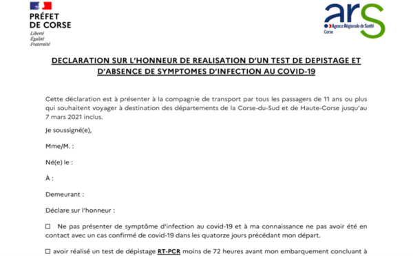 À compter du samedi 6 février et jusqu’au 7 mars inclus, les voyageurs se rendant en Corse devront présenter à l’embarquement un test RT-PCR de “moins de 72 heures” et une attestation sur l'honneur. Téléchargez ici la nouvelle déclaration sur l’honneur à...