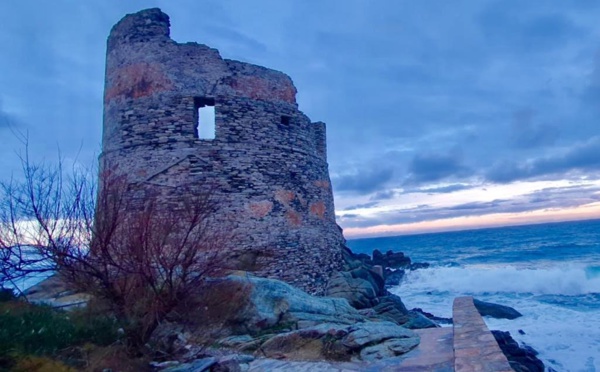 Un ciel d'hiver chargé de nuages qui estompent presque l'horizon, la mer Tyrrhénienne qui vient en chapelets ourlés mourir à ses pieds : a torra d'Erbalonga, dépourvue de ses atours estivaux, qui font d'elle un des monuments les plus photographies de Corse,...
