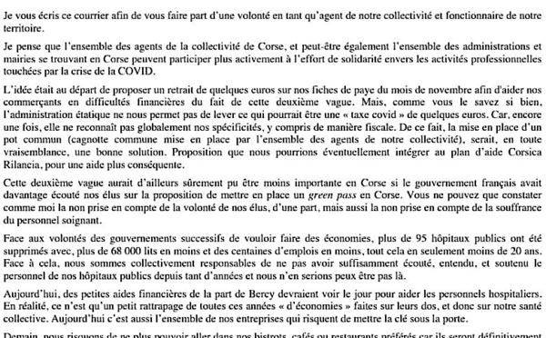Une cagnotte des agents de la Collectivité de Corse pour les entreprises en difficulté ? C'est la proposition que formule dans une lettre ouverte à Gilles Simeoni, président du Conseil exécutif, un fonctionnaire de la CdC. " Nous pouvons et nous devons, nous...
