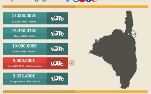 Le tirage Loto du mercredi 1er juillet 2020 a fait un grand gagnant en Haute-Corse. Ce soir-là, 5millions d’euros étaient en jeu, une seule grille a trouvé la combinaison gagnante et c’est sur l’île de Beauté que la grille gagnante a été cochée. Le tirage du...