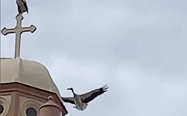 VIDEO - Un couple de cigognes fait une pause sur le clocher de Piana