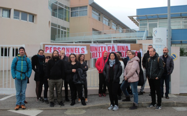 Des enseignants grévistes du Collège Jean-Félix Orabona de Calvi, rejoints par des cheminots, se sont rassemblés ce matin devant l'établissement. Très peu d'élèves ont participé aux cours.