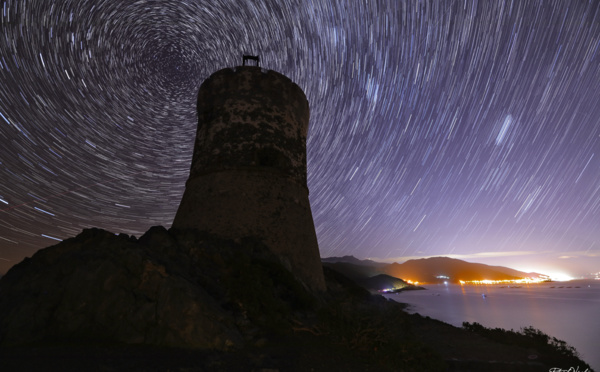 " Après ces jours de pluie, un magnifique ciel étoilé brille sur les Sanguinaires. Le sac et le ressac des vagues glisse dans la nuit. Au loin brillent les lueurs de la ville et par-dessus la tour, on peut observer les étoiles qui dérivent, et la rotation...