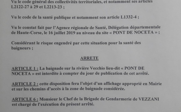Même s'l fait chaud et la tentation de plonger dans l’eau est forte, la mairie de rappelle : la baignade dans la rivière du Vecchio au niveau du Pont de Noceta est interdite par arrêté pour raison sanitaires.